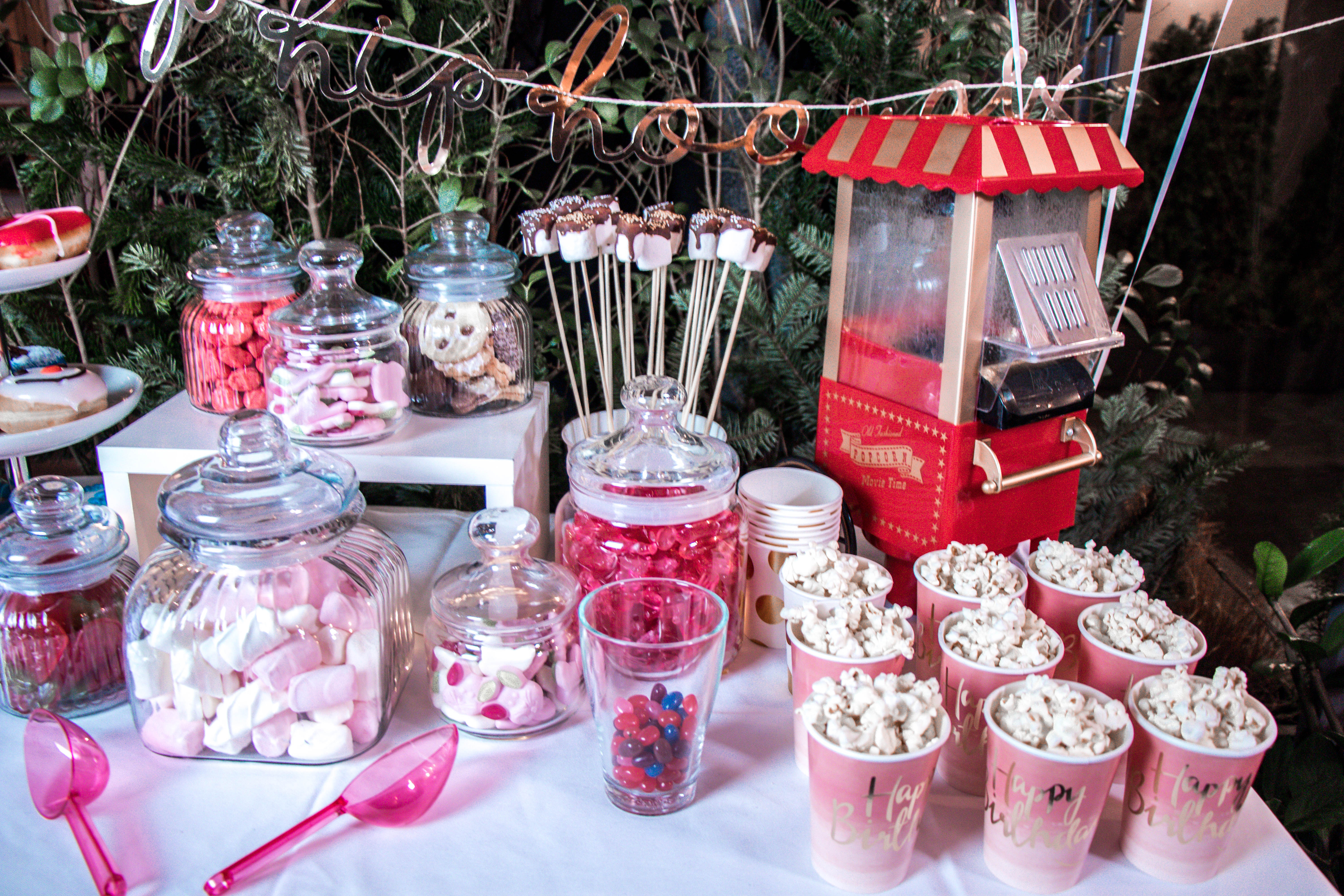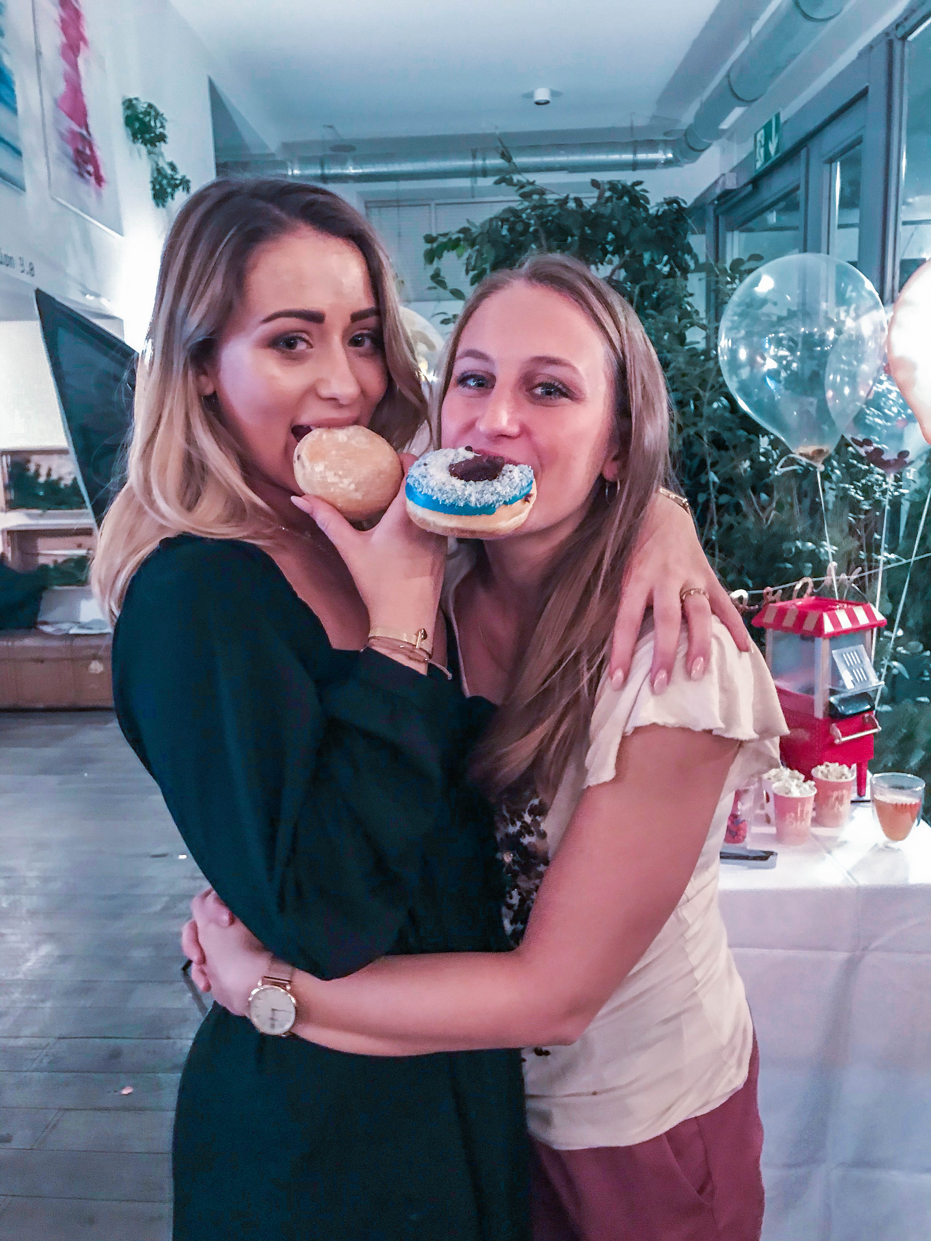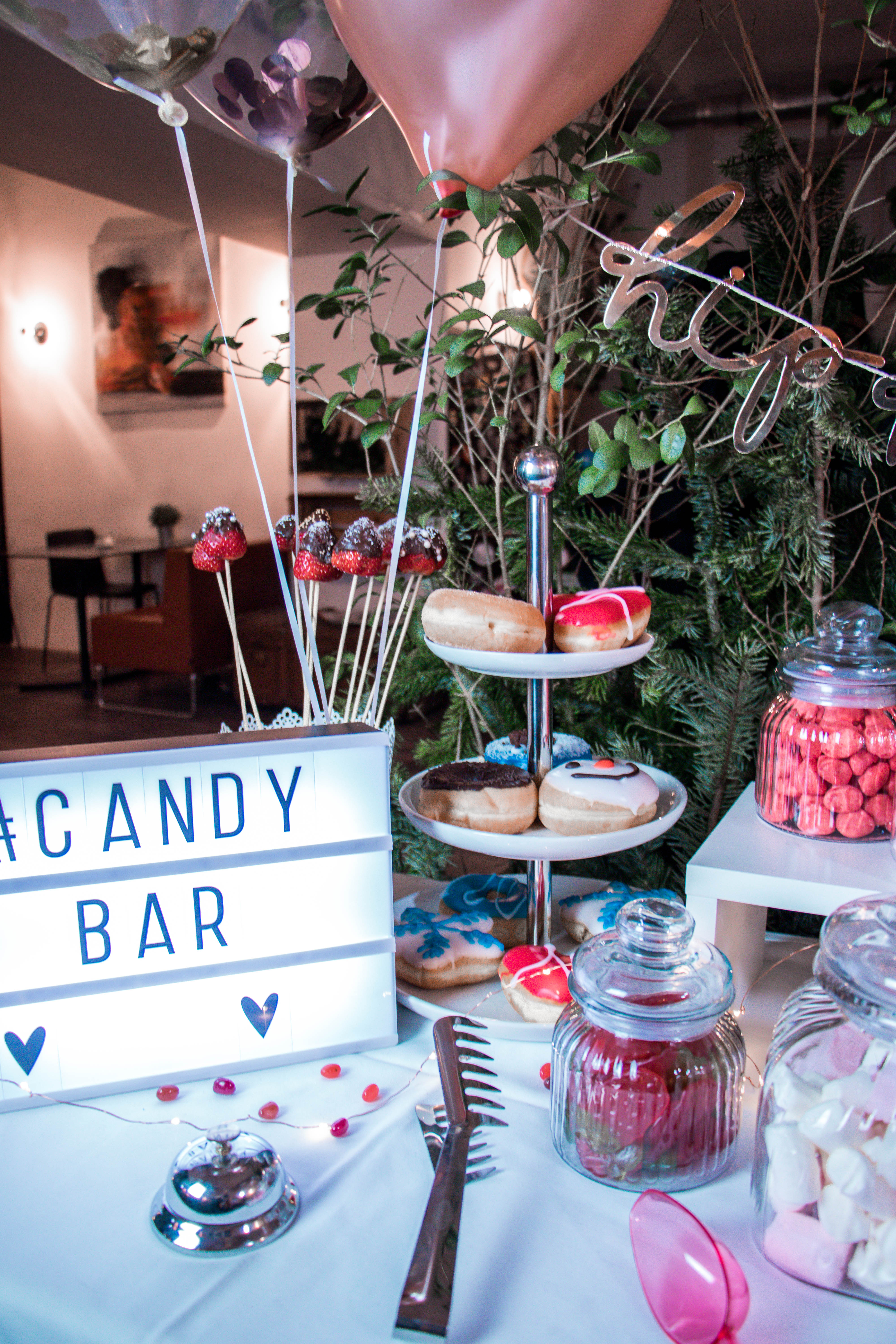 Bei einer Party mit dem Motto Candy darf natürlich auch eine Candy Bar nicht fehlen. Von Gummi-Erdbeeren und pinken Gummi-Flamingos, zuckersüßen Marshmallows, bunten Jelly Beans, rosaroten Katjes Häschen bis hin zu schokoglacierten Erdbeeren und Marshmallows, gab es alles was das Süßigkeiten-Herz begehrt. Vollendet wurde meine Candy Bar durch die super süßen, bunten und schmackhaften Donuts von Dunkin Donuts, geliefert durch Uber Eats, die schon nach kürzester Zeit verputzt waren. Ich bin übrigens ein ganz großer Donut-Fan, insbesondere, wenn sie nicht nur super schmecken, sondern auch noch so entzückend und süß aussehen.